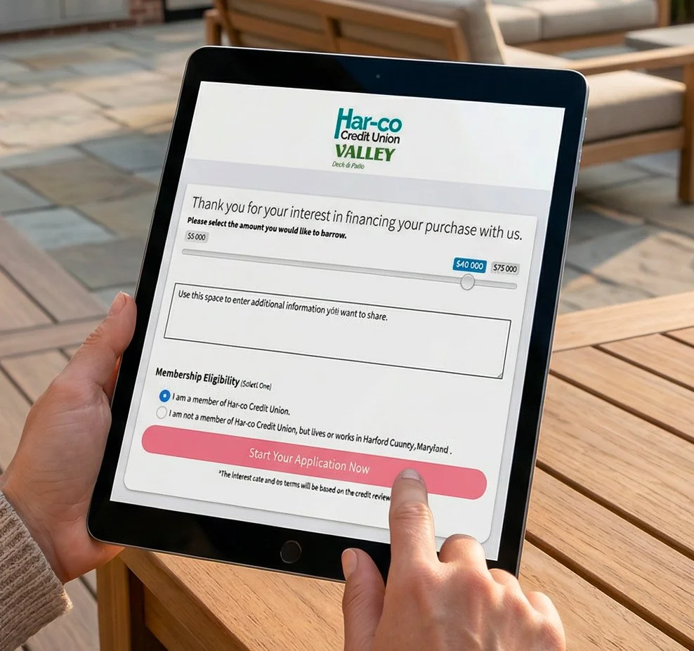 Valley Deck & Patio is proud to offer financing through Har-Co Credit Union for Harford County residents. We understand that outdoor living projects are a meaningful investment, and this partnership helps make that investment more accessible.