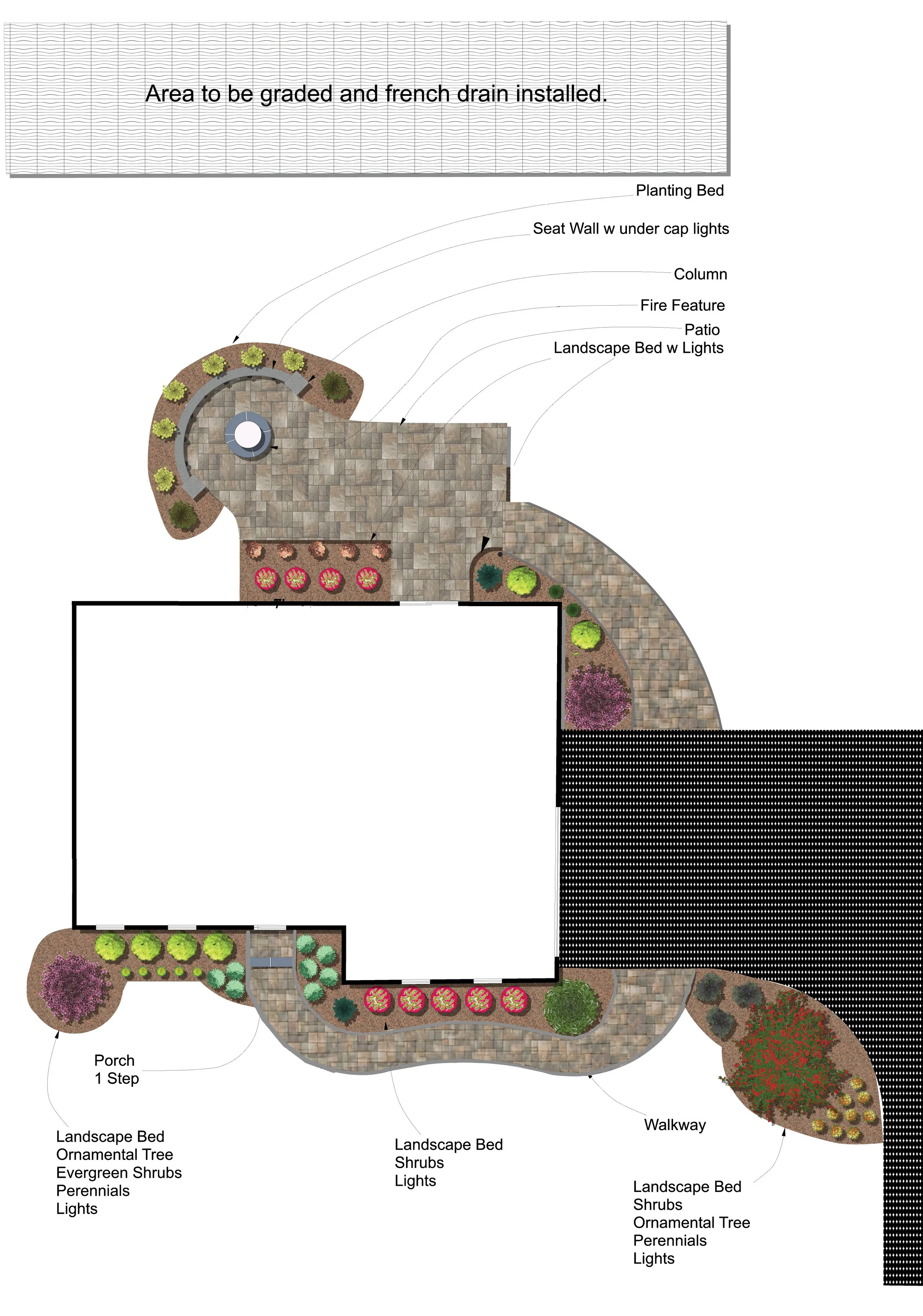 Landscape beds line both the walkway and patio. These plantings soften the hardscape and help tie the entire design together from front to back.