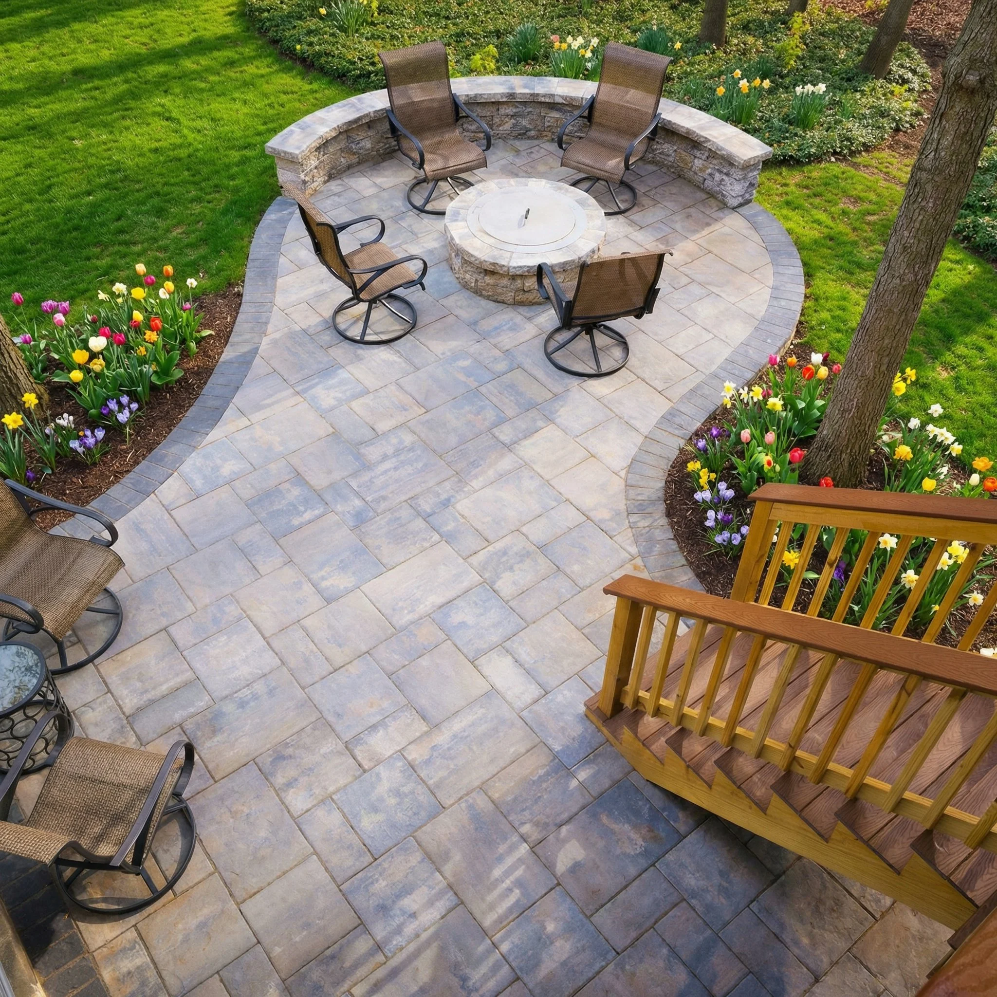 A curved patio design helps the outdoor space feel more natural and inviting. The soft curves blend into the surrounding landscape and create a relaxed atmosphere.