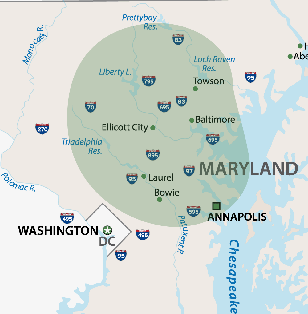 Annapolis • Catonsville • Clarksville • Cockeysville • Columbia • Crofton • Davidsonville • Eldersburg • Elkridge • Ellicott City • Fulton • Gambrills • Hanover • Jessup • Marriottsville • Owings Mills • Phoenix • Pikesville • Reisterstown • Severna Park • Sykesville • Timonium • Towson • West Friendship